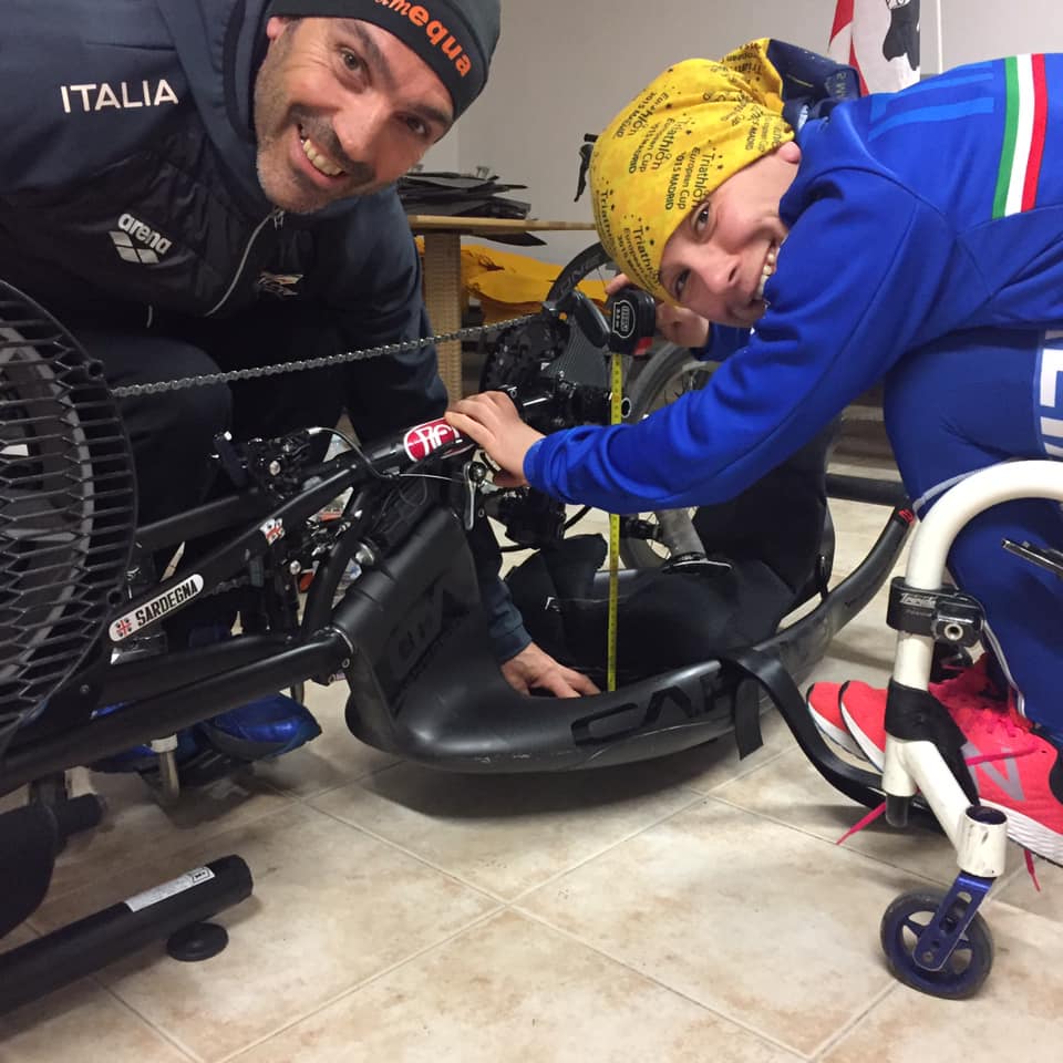 Dopo aver iniziato la preparazione si sono uniti a noi alcuni atleti che praticano handbike: Mattia si meraviglia di continuo come i nuovi arrivati non riescano a sviluppare le andature che faccio io nonostante siano più giovani.