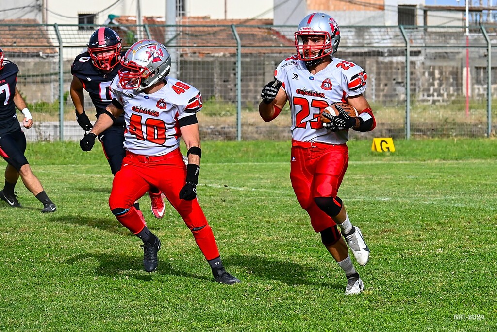 A furia di insistere arriva il vantaggio, ancora con una progressione pazzesca di Loche che poi provvede pure alla finalizzazione. Passano sette minuti e gli avanti cagliaritani confezionano il loro terzo capolavoro, stavolta con Federico “Nero” Dessì che sfrutta le intese superlative con i compagni di linea. Finalizza poi Edoardo Stara ben riverito dal suo qb. Tutto il reparto incanta, e prosegue la sua marcia trionfale anche dopo la segnatura dell’autoctono Ripamonti cui si associa l’extrapoint calciato dal solito Anzani.