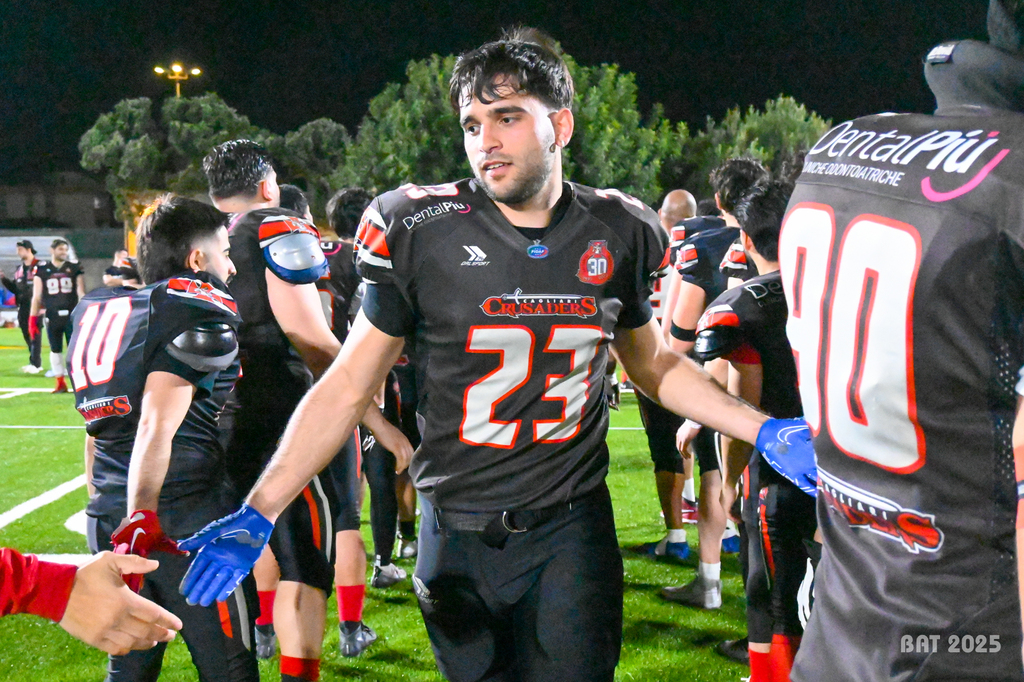 “Siamo usciti dal campo con una vittoria più che meritata – dichiara – e la striscia positiva continua. Siamo visibilmente contenti, ma prima di essere felici dobbiamo vincere le restanti due gare”. La visione realistica delle cose aleggia sempre nelle sue meningi: “La perfezione non siamo riusciti a raggiungerla – continua Palmas – quindi in qualche drive abbiamo dovuto ricorrere al punt; per tre volte ci hanno beffato con dei big play individuali, diciamo però che la difesa era sempre sul pezzo. Quanto ai touchdown annullati, tre sono stati causati da falli tenui ma evidenti; nel quarto, probabilmente, c’è stata un po’ di generosità arbitrale nell’annullarlo. Il riuscire a guadagnare iarde, arrivare fino all’end zone e realizzare con successivo annullamento ci dava comunque fiducia. Poi è subentrata l’ansia di non vedere il risultato mutare sul tabellone, in alcuni momenti è stata davvero tanta. A furia di insistere ce l’abbiamo fatta”.