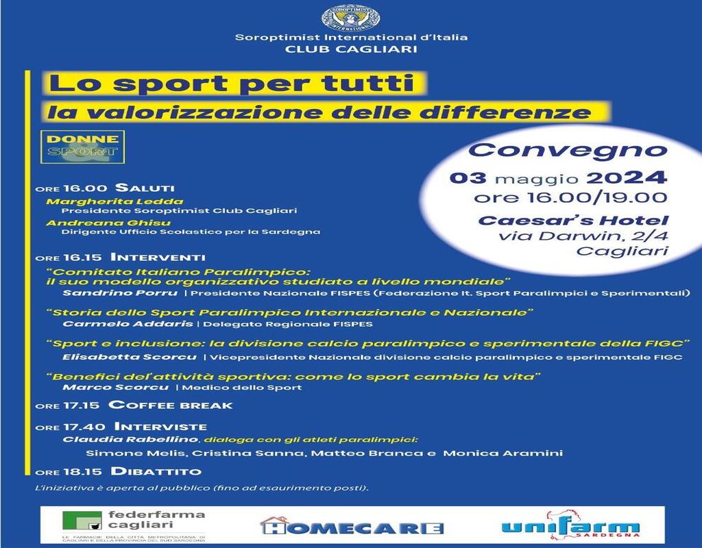 Vorrei invitare tutti al convegno del 3 maggio 2024 a Cagliari, presso il Caesar’s Hotel in via Darwin 2/4 (h. 16 – 19) dal titolo “Lo Sport per tutti, la valorizzazione delle differenze”. Si affronterà il tema dell’inclusività e dell’importanza dello sport per migliorare la qualità della vita, anche nelle disabilità. Lo reputo un momento importante e di partenza per una migliore sensibilizzazione sull’argomento.