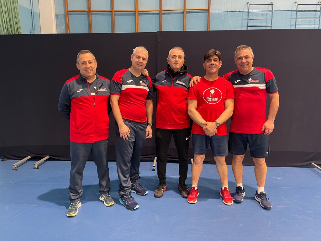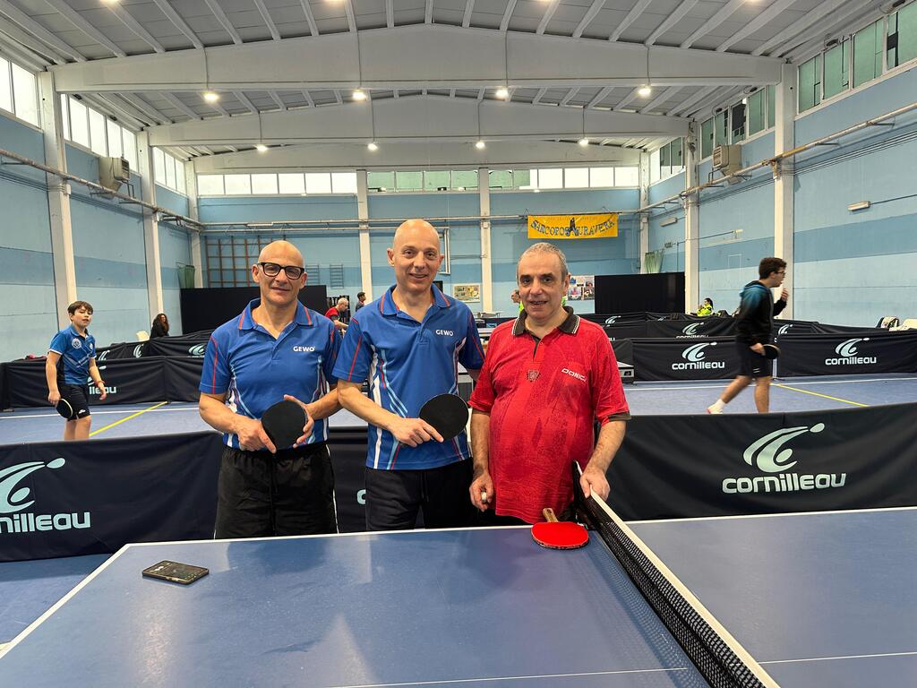 Giuseppe Curreli, Paolo Marinelli, Stefano Manca (Marcozzi Boss): “Per noi una giornata che ricorderemo: a Muravera la Marcozzi Boss (quattro giovanotti tendenti ai sessanta anni, insieme al giovane di squadra, Aldo Puleo, che ne ha appena 49) vince il campionato ed i play off e ottiene il pass per l’accesso alla D 1. Tutta la squadra ha partecipato alla vittoria, ma il merito principale deve essere dato a Licio Rasulo e a Stefano Manca, che anche in occasione dei play off hanno offerto ottime prestazioni, uscendo sempre vincitori nei rispettivi incontri. Inedita la formula di gioco per la D2, che costringeva a schierare da subito i più forti, dato che l’incontro veniva aggiudicato da chi vinceva per primo 4 delle sei partite a referto. La giornata particolare della Marcozzi Boss inizia col botto, con l’incontro più difficile contro la squadra di Iglesias. La partita non parte bene, perché Paolo Marinelli, ancora assonnato, non riesce ad entrare nel match contro Roberto Pili. Seconda partita durata meno della prima in cui Licio, al quinto set, prevale su Mauro Usai, nell’incontro forse più difficile della giornata. Stefano Manca vince a fatica contro un coriaceo Maurizio Vacca per 3-1. Nel resto del match, vittorie più agevoli di Stefano Manca sull’affaticato Mauro Usai e di nuovo Licio Rasulo su Roberto Pili. La giornata prosegue col match tra Marcozzi e Olbia. Entra Giuseppe Curreli, anche lui con poche ore di sonno in corpo e infatti perde in tre set contro Pier Paolo Melis. Anche questa volta Licio e Stefano vincono le restanti partite senza particolari problemi, salvo qualche patema per Licio contro Melis, che lo trascina fino al quinto set. Contro la Muraverese i boss Licio e Stefano riposano e rivive il nucleo storico della ex Cagliari TT, composto da Paolo Marinelli, Aldo Puleo e Giuseppe Curreli. La partita per la verità non è stata impossibile, perché affrontiamo i padroni di casa che non schierano Gianluca Mattana, rimasto in panchina. Paolo fatica, ma batte Alberto Piras. Giuseppe ha la meglio in tre set con Federico Cuccu e poi replica la vittoria sempre in tre set con Alberto Piras. Aldo incappa in un match difficile contro Marco Dessì, con cui perde al quinto. Il quarto punto lo conquista Paolo, riscattando il compagno di squadra e prevalendo in quattro set su Marco Dessì.