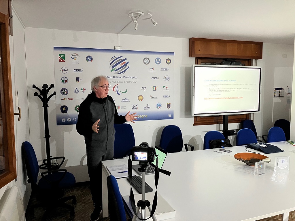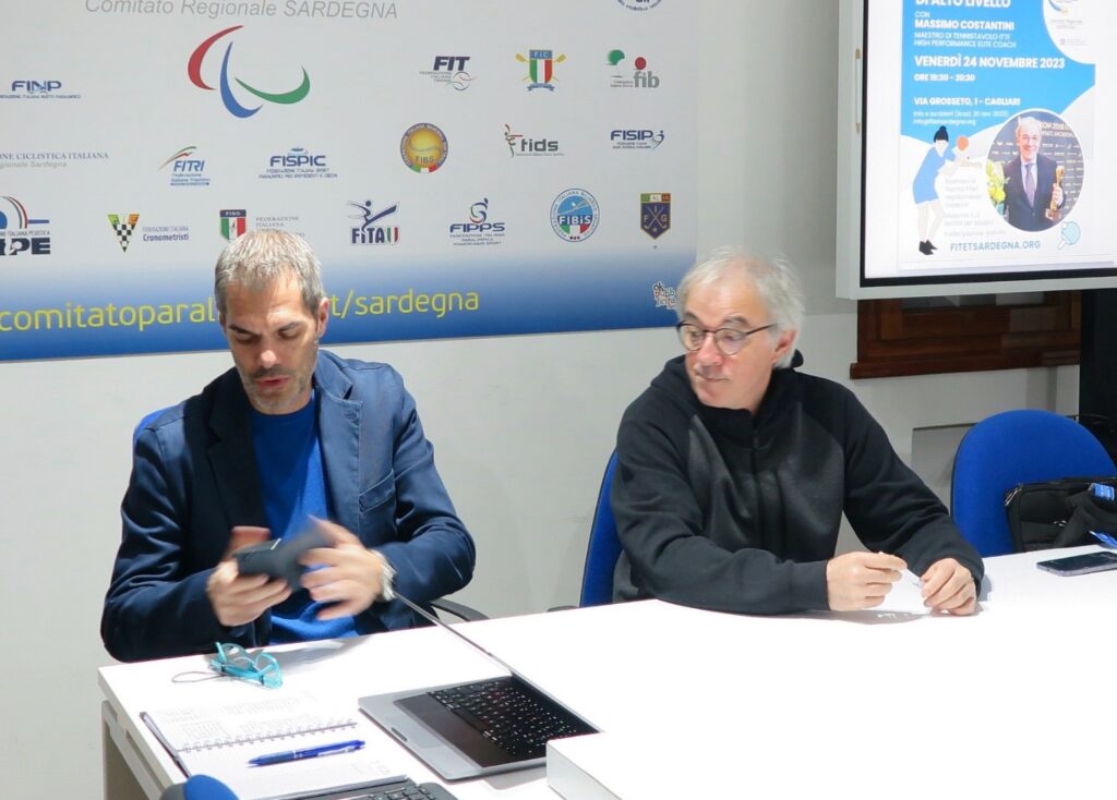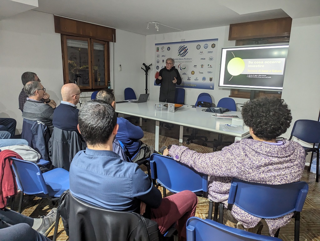 Non avendo a disposizione un tavolo, racchette e cesto di palline, ho creato una presentazione che toccasse temi tecnici senza l’ausilio della tecnica, puramente tattici e suddivisi in quattro parti con delle appendici. In primis la tecnica di base, di seguito quella avanzata, e poi le due figure chiave che maggiormente interessano la platea l’atleta e l’allenatore. All’interno di questi quattro grossi blocchi sono stati sviluppati degli aspetti molto più pratici che potessero interessare maggiormente i tecnici sardi come per esempio l’approccio di un tecnico in un nuovo club con target di atleti disomogeneo. Nel dettaglio: gestire la convivenza padre figlio all’interno della stessa palestra; gestire gli agonisti bravi con tutti gli altri; rapporto tecnico e atleta di alto livello; organizzazione di un percorso paralimpico per un atleta.