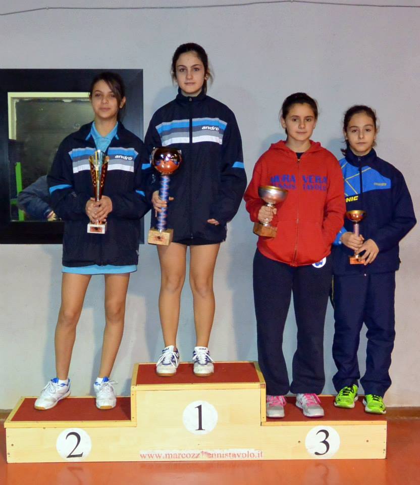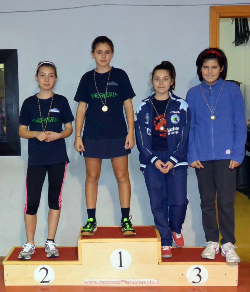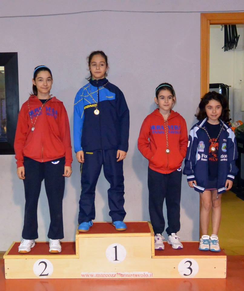 In questa categoria la società Muraverese sembra non avere rivali. Ha partecipato a cinque manifestazioni su sei (era assente al torneo di Nulvi ad ottobre), conseguendo altrettanti successi. L’ultimo della serie porta la firma di Aurora Piras, vincitrice anche a Guspini e Muravera. La giovane pongista sarrabese ha avuto la meglio su una rosa di nove partecipanti. Ha prevalso nel suo girone senza problemi imponendosi su Serena Anedda (Muravera TT) e Delia Sanna (Saturnia Cagliari). Negli altri due raggruppamenti le migliori sono risultate Alice Mattana (Muraverese) e Giulia Zucca (Muravera TT) che a sorpresa ha battuto la sua compagna più grandicella Sara Congiu.