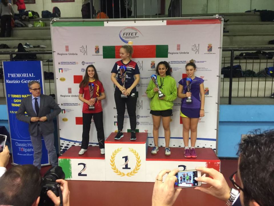 Ma la notizia che più appassiona il movimento sardo riguarda il quarto posto ottenuto dalla autoctona Michela Mura nella categoria Allievi femminile. Un traguardo importante per la sua società, La Saetta Quartu S. Elena, che la sta forgiando con i sacrifici tipici delle piccole società che hanno mezzi limitatissimi per garantirsi una degna sopravvivenza. Giustificata la contentezza del direttore tecnico quartese Christian Ferro: “Le sensazioni scaturite dalle recenti apparizioni di Michela erano buone – ha detto – infatti siamo andati a Terni con l’idea di infastidire le prime quattro della categoria. Il girone inizia alle 8,30 e anche se con un po’ di “ansia da prestazione” Michela si conferma prima del suo girone battendo Soriga e Gibellato per 3-1 e Cerritelli 3-0. Al tabellone si gioca subito con Angela Annunziata, una delle giocatrici più ostiche per lei, infatti già il primo set finisce ai vantaggi, va sotto 2-1 ma trova calma, concentrazione e top a giro vincendo una partita difficile. Nei quarti di finale incontra Aurora Cicuttini, partita lunga e molto intensa, tutti scambi prolungati con top controtop e cambi gioco di rovescio. Finisce 3-0 e la mia giocatrice guadagna la prima semifinale in un torneo nazionale. In semi ad aspettarla c’è Gaia Smargiassi che fa valere la sua maggiore esperienza vincendo 3-0 una partita comunque giocata fino alla fine. Finisce al quarto posto con un altro passo avanti, brava Michela”.
