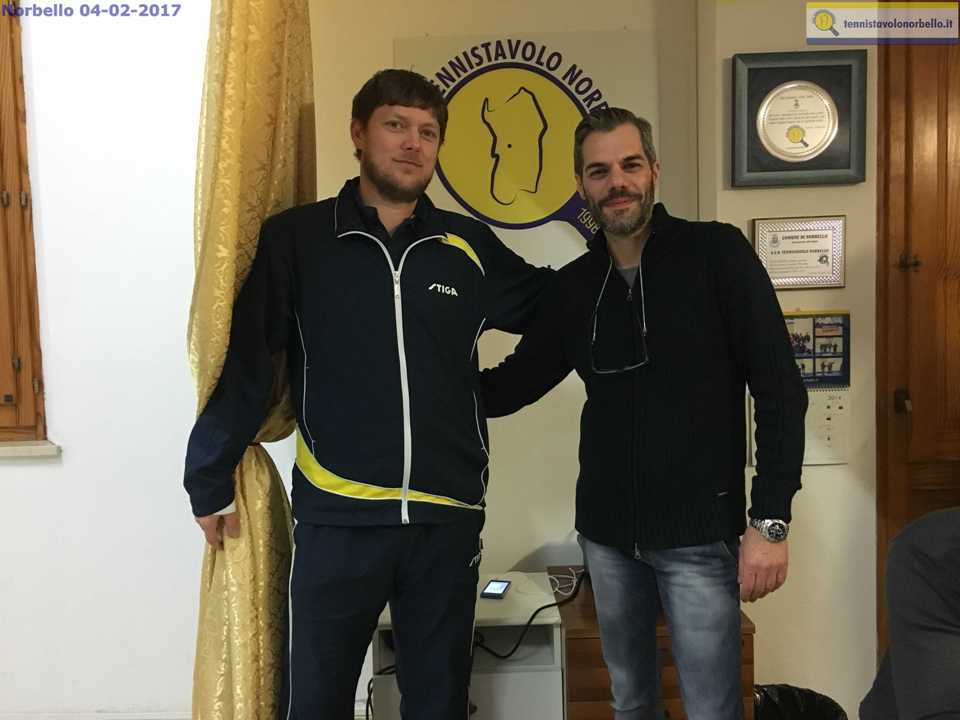 Il presidente della Fitet Sardegna Simone Carrucciu con l’atleta del Post Sv Muhlhausen Bohumil Vozicky (Foto Gianluca Piu)