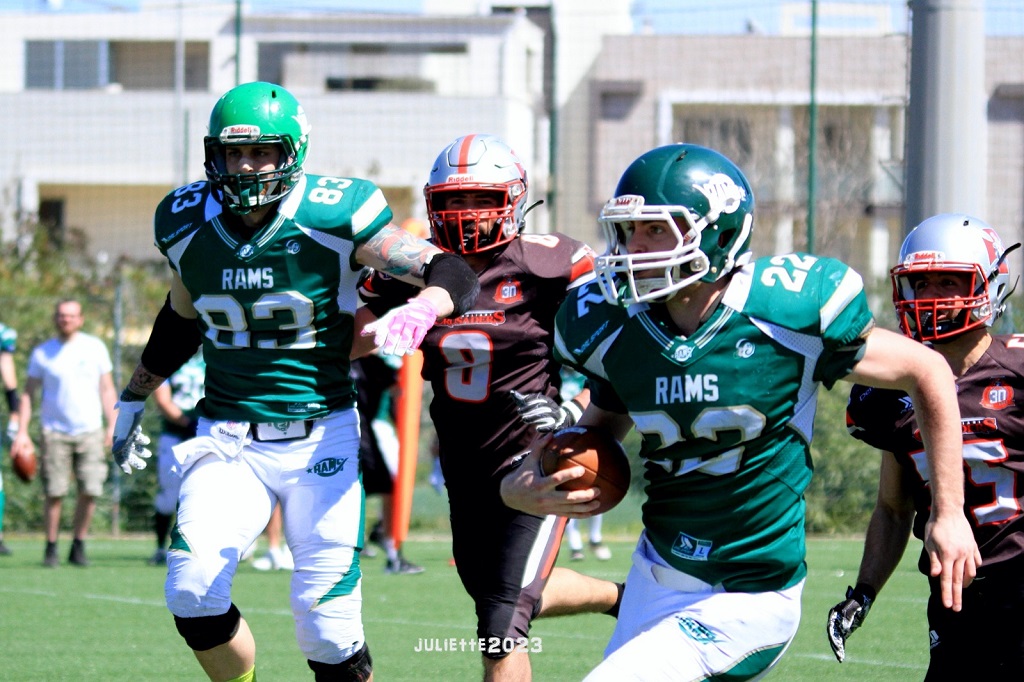 Difesa in difficoltà durante un attacco dei Rams nel 2023 (Foto Giulia Congia)