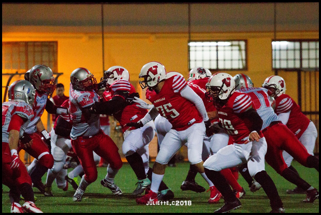 Durante il primo quarto, a parte le solite inevitabili fallosità da ambo le parti, si può notare un Matia Pisu che nel ricevere l’ovale crea subbuglio tra i varesini, faticanti nel controllare le fulminee movenze seguite dalle note progressioni da centometrista. Di lì a poco il risultato viene sbloccato: si può solo intuire lo sviluppo dell’azione che permette a Riccardo Pili di correre con caparbietà verso l’end zone. Merito di una farsa condita di finte che oltre a confondere gli spettatori fa perdere l’orientamento anche ai Gorillas: quando si accorgono dell’inghippo è già troppo tardi. Andrea Lianas tenta la pedata addizionale ma non azzecca il bersaglio, giustificandosi scherzosamente di non aver orientato bene la caviglia al momento di indossare le scarpette.