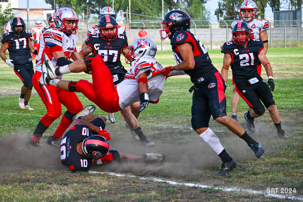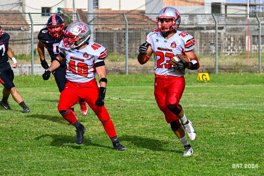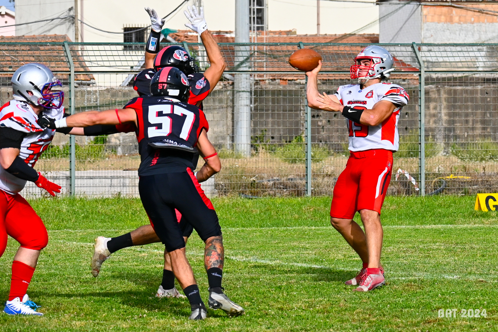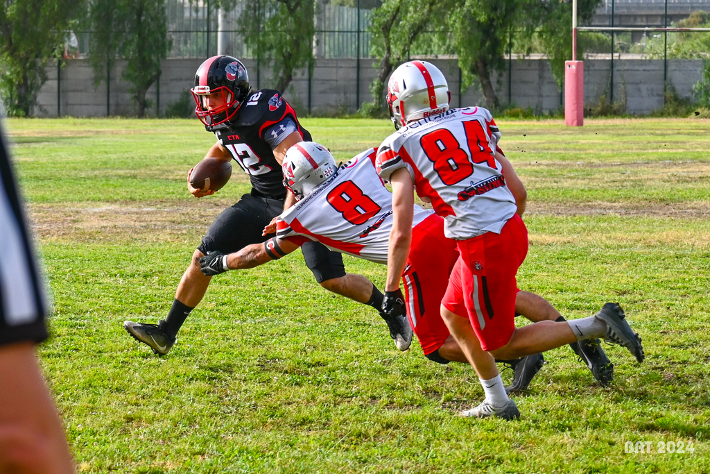 Luca Pacinotti si distingue per aver interrotto il ciclo positivo e martellante avversario che stava provando la quinta segnatura su altrettanti drive. Dopo un altro gioco aereo di Meloni all’indirizzo di Agnesa si riaccende una piccola fiammella di speranza, immediatamente soffocata per i ripetuti falli ospiti che hanno condizionato non poco la loro prestazione. In avvio del secondo tempo è Giuliano Guttadauro a farsi largo tra le maglie avversarie e dopo il calcio di Maugeri il punteggio sale a 35. William Badas riesce a neutralizzare l’ennesima azione penetrante dei locali che però, nell’ultimo quarto, incrementano il bottino con un field goal di Edoardo Gulisano.