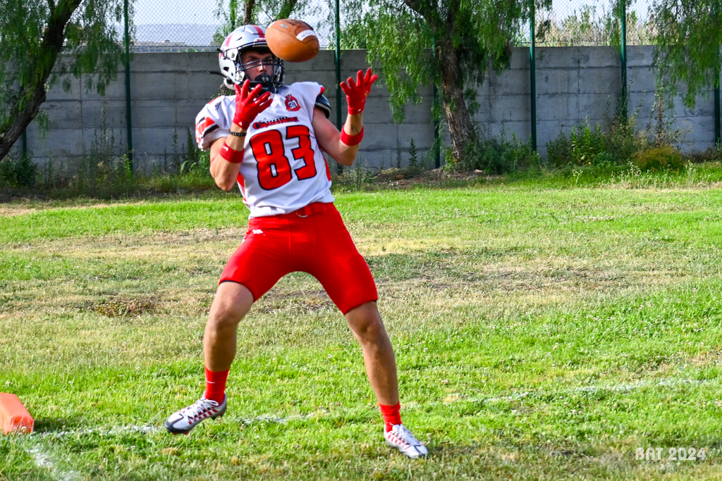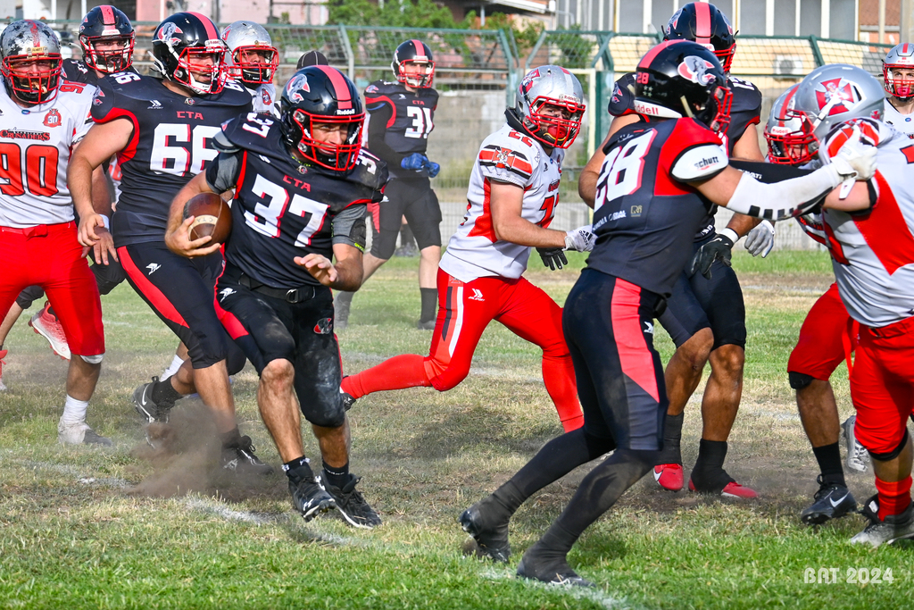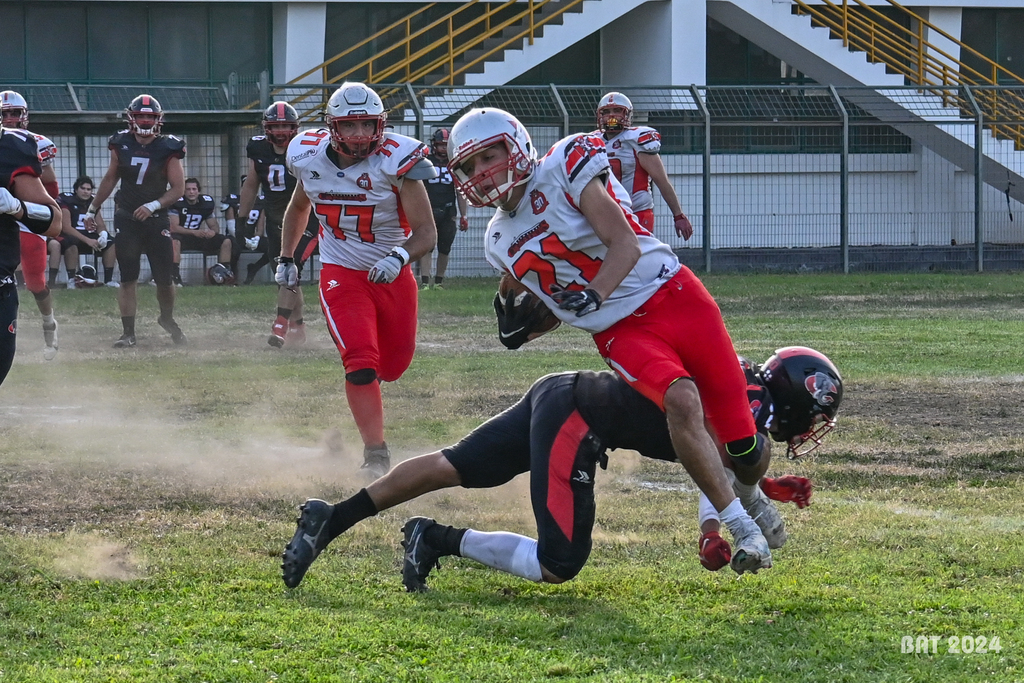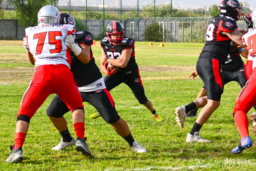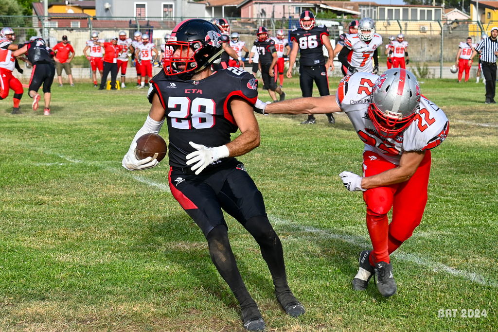 Luca Pacinotti si distingue per aver interrotto il ciclo positivo e martellante avversario che stava provando la quinta segnatura su altrettanti drive. Dopo un altro gioco aereo di Meloni all’indirizzo di Agnesa si riaccende una piccola fiammella di speranza, immediatamente soffocata per i ripetuti falli ospiti che hanno condizionato non poco la loro prestazione. In avvio del secondo tempo è Giuliano Guttadauro a farsi largo tra le maglie avversarie e dopo il calcio di Maugeri il punteggio sale a 35. William Badas riesce a neutralizzare l’ennesima azione penetrante dei locali che però, nell’ultimo quarto, incrementano il bottino con un field goal di Edoardo Gulisano.