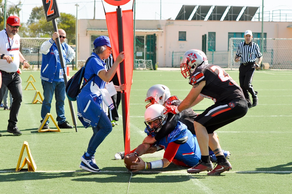 Galvanizzati dal vantaggio, i difensori crociati spalancano le fauci pronti a sbranare qualsiasi cosa si aggiri nei loro paraggi. E nei capovolgimenti di fronte si mettono in mostra tutti gli “offensivi”. Solo la bravura dei locali gemelli Delussu evitano il peggio. La compagine di casa prova a shakerare nel migliore dei modi le sue combinazioni di corse e lanci ma non è proprio giornata. Dopo le efficaci chiusure della diga Giuseppe D’Angelo arriva il momento di raddoppiare. Ancora Siro Thomas Lauchlan fa guadagnare iarde ai suoi con un’altra pregevole ricezione. Di seguito, ma nel lato opposto, parte un altro invito del qb Meloni, questa volta ben sfruttato da Felipe Brisu. Non paghi delle straordinarie incursioni, Matia Pisu aggiunge altri due punti nel carniere, abbrancando nella sua linea stilistica “Air” l’ennesimo suggerimento di Michelino l’ispiratore (14-0). Le occasioni si moltiplicano. Quando Mattia Billardello innesta le marce lunghe diventa un gran rompicapo riuscire a trattenerlo; lui sguscia imperterrito, ma solo al quarto placcaggio è costretto a crollare sul sintetico. Lauchlan insiste nel mostrare le sue qualità di raccogli ovali anche quando stanno per rasentare il suolo. E Mandas solo per un soffio non va in meta perché la traiettoria della palla scagliata da Michele Meloni viene deviata di un niente.