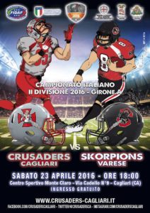 | 23/04/2016 | Crusaders Cagliari – Skorpions Varese | 18:00 |