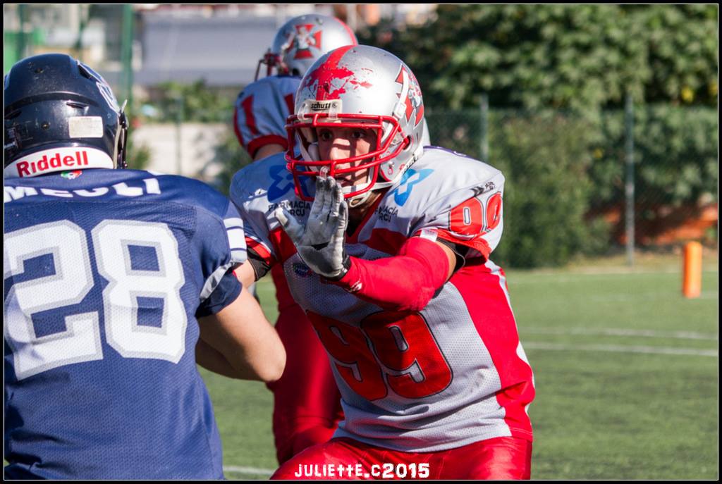 L’esecuzione dei placcaggi continua ad essere un problema: accade infatti che seppure a pochi centimetri di distanza, gli avversari riescano a sgusciare via con troppa semplicità, perché il crociato di turno non trova forza e giusto tempismo per atterrarli. C’è stata pure una nitida possibilità di realizzare un touchdown: il lancio preciso di Matteo Marceddu si perde tra le due mani di Nicola Mei, trovatosi in una posizione ideale per avviarsi verso la “gloria” in perfetta solitudine. Anche il reparto offensivo ha consentito ai locali di effettuare qualche intercetto di troppo. Resta un’ultima gara: domenica mattina a Monteclaro arrivano gli Skorpions Varese: un’ottima occasione per chiudere la stagione con un sorriso.