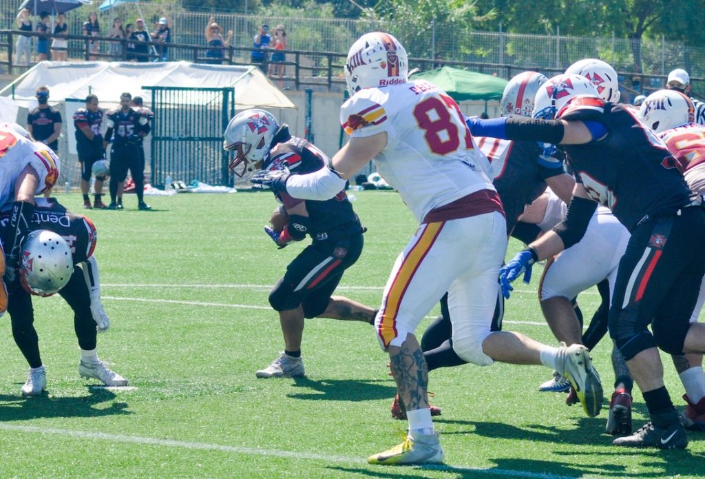 Nella gara di ritorno con la Legio XIII non sono mancate le emozioni ma anche interminabili attimi di paura quando allo scadere del primo tempo Bonifacio Ruggiu, dopo un accidentale scontro con un suo compagno di squadra si è ritrovato a terra e immobile. Tempestivo ed organizzato l’intervento da parte dello staff medico e di soccorso coordinato dal medico sociale crociato E. Marongiu che ha ravvisato la concussione cerebrale. L’atleta è stato immobilizzato e dopo un’iniziale valutazione, secondo i protocolli, è stato trasportato in pronto soccorso. “Gli spettano quindici giorni di riposo totale – ha affermato la dottoressa Marongiu – seguirà rivalutazione per graduale ripresa dell’attività fisica”. Gli animi dei suoi compagni, dopo la fifa iniziale, erano già più rasserenati perché “Bonito” interagiva dall’ambulanza facendo capire di stare male ma che se la sarebbe cavata alla grande. E probabilmente questa situazione ha fatto sì che al ritorno in campo i cagliaritani si mostrassero ancora più concentrati, pronti a strappare la vittoria da dedicare allo stimatissimo linebacker. E così è stato perché al fischio finale il divario tra le due franchigie è diventato importante e allo stesso tempo carico di rammarichi per quello che poteva essere e non è stato.