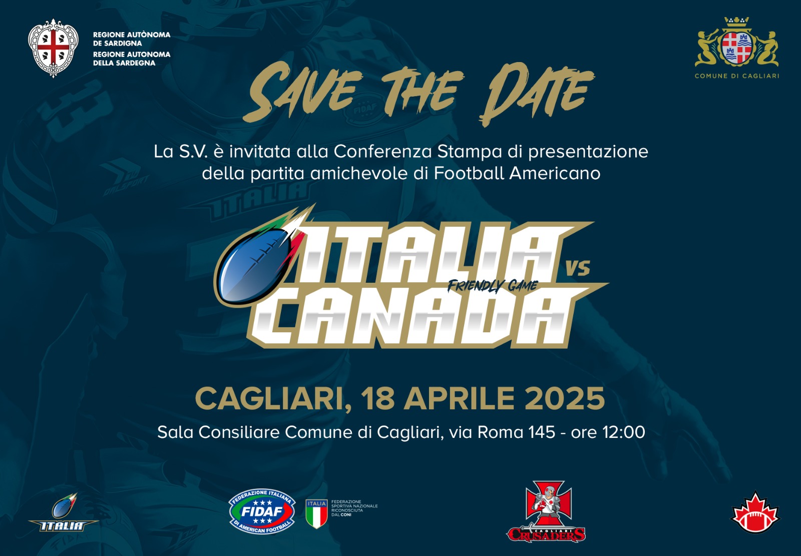 Il programma ufficiale prevede anche una Conferenza Stampa venerdì 18 aprile alle ore 12:00, presso la Sala Consiliare del Comune di Cagliari, alla presenza delle autorità locali, dei vertici FIDAF e dei rappresentanti delle due squadre nazionali. A seguire, nel pomeriggio, sempre al Terramaini, interessante antipasto, con i Crusaders Cagliari che affronteranno in uno scrimmage ‘triangolare’ sia la selezione azzurra, sia quella canadese.