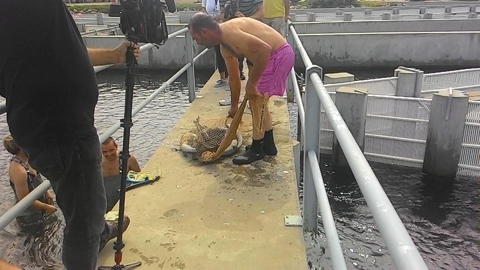 L’inglese Chris e il giuliano Davide pescano i muggini a mano alla peschiera di Tortolì (Foto Sara Melis)