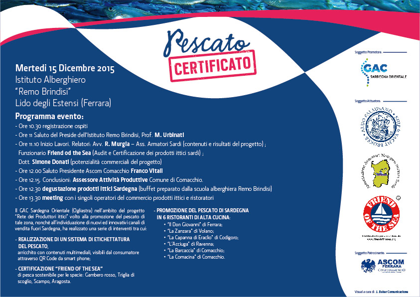 Durante l’incontro al “Remo Brindisi” parleranno anche il preside dell’Alberghiero Massimiliano Urbinati; Simone Donati si soffermerà sulle potenzialità commerciali del prodotto: Interventi anche presidente dell’Ascom Comacchio Franco Vitali, dell’assessore alle attività produttive del comune di Comacchio Sergio Provasi e di un funzionario di Friend of the Sea.