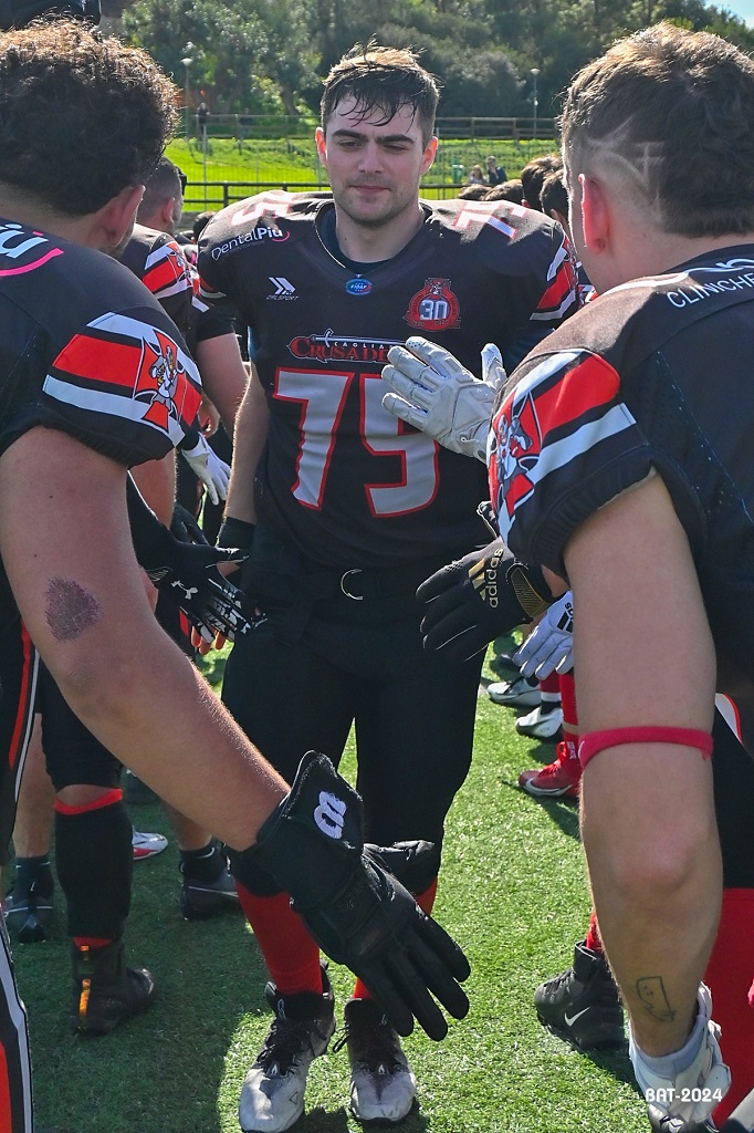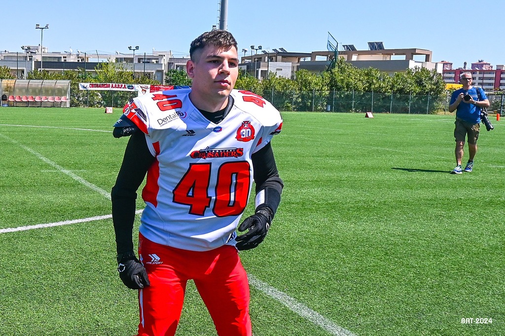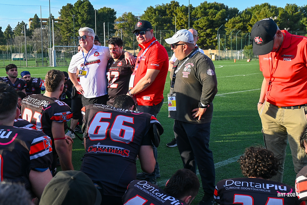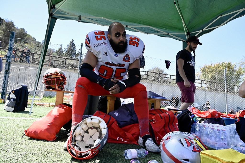 Appare scontato arguire che l’head coach Tim Tobin non temesse particolari tracolli, simili agli unici ma devastanti fatti registrare a Segrate. Ma è anche facile ipotizzare che pretenda tangibili miglioramenti di gara in gara. Dalla sua disamina sembrerebbe che abbia apprezzato la condotta dei suoi. “Abbiamo iniziato lentamente – dice – ma nel secondo tempo giochiamo come una squadra. Sergio Andrea Meloni, un’altra grande risorsa appartenente al variegato patrimonio umano dei Cru, ha chiamato l’attacco svolgendo un buon lavoro. Le linee offensive mi hanno sorpreso, la loro prestazione ottimale ha permesso che la palla macinasse iarde a ripetizione grazie alla intensa caparbietà dei runningback. La difesa è stata grandiosa per l’intera sfida, propiziando il cappotto finale. Nel secondo tempo abbiamo dovuto intensificare l’ardore agonistico, approfittando di un’avversaria che palesava evidenti segni di stanchezza e poca lucidità. Nel ricapitolare quanto sia soddisfatto di questa partita vorrei riservare una nota di merito al qb di riserva Max Mandas che nonostante l’influenza, si è allenato tutta la settimana per supplire l’assente Michele. E poi un plauso pure allo special team che si è messo in mostra sia nei punt, sia nei punt return. E in definitiva la squadra ha risposto a tutto ciò che le è stato lanciato contro. Come dormire in aeroporto”.