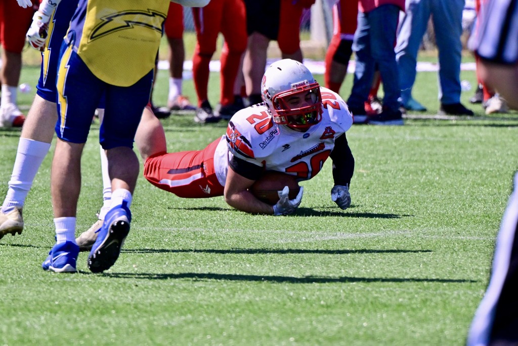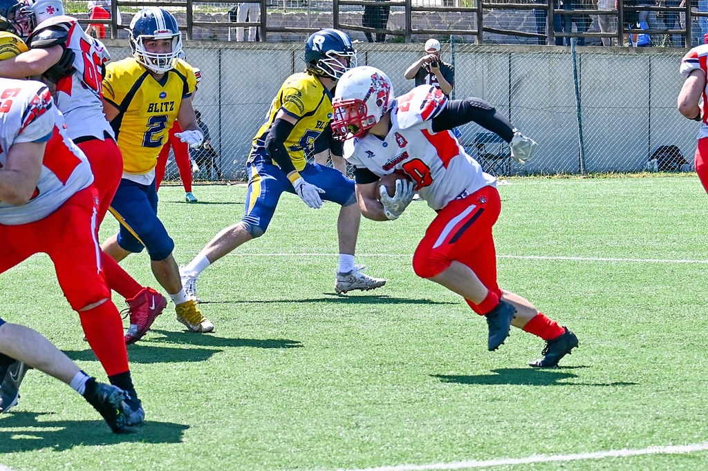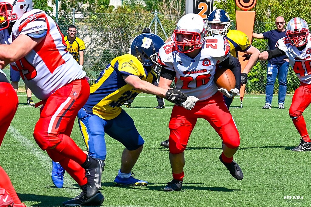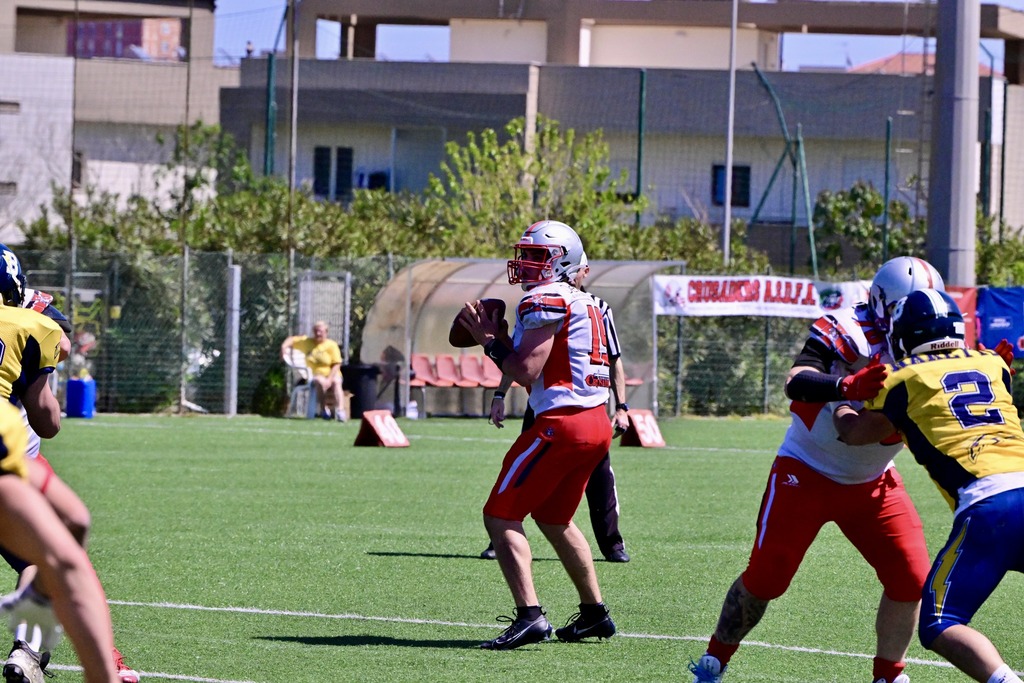 Completano la missione fuori le mura le audaci corse del rookie Federico Pili e del solito Michele Meloni che nell’ultima settimana è stato costretto a disertare gli allenamenti. Si pecca nelle trasformazioni, ma l’unica arriva a coronamento dell’ultimo touchdown con un’altra palla “melonesca” raccolta dal buon Dessì.