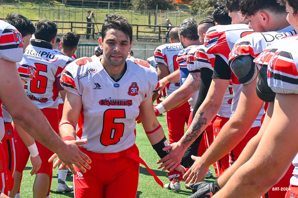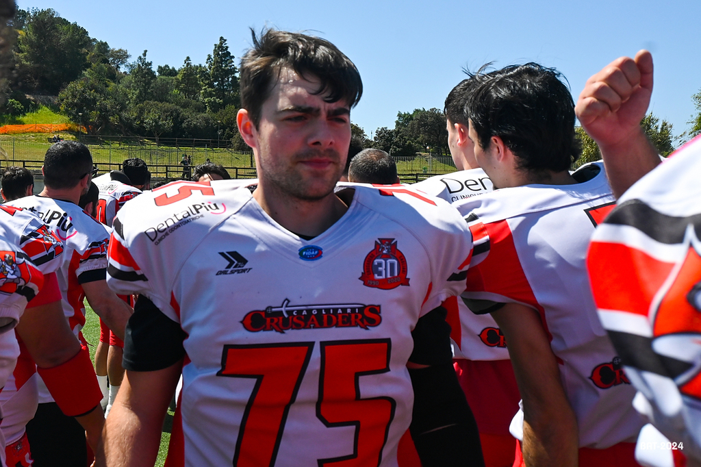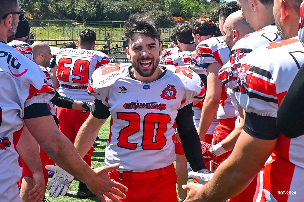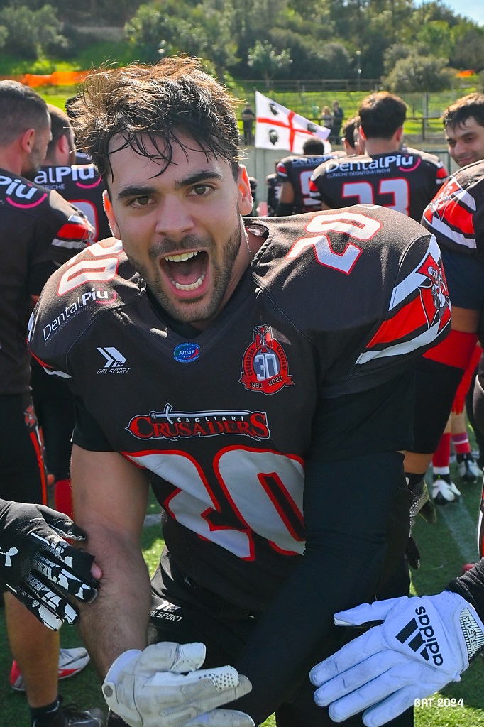 Gran effetto incredulità. Lo si prova nel vedere la classifica del ranking nazionale Nine Football League, stilata dalla FIDAF alla conclusione della stagione regolare. La franchigia cagliaritana occupa il sesto posto assoluto, e il terzo della Conference Sud. Posizione che le permette di giocare in casa il primo turno di wild card (1/2 giugno 2024), opposta agli Achei di Crotone, terza classificata nel girone A con tre vittorie su sei partite. Chi vince accede alla semifinale di Conference. La notizia giunge mentre i crociati, reduci dal perentorio 32-0 inflitto ai Gorillas, contano le ore in sala d’aspetto a Linate, in una notte infinita di assonnate elucubrazioni, attendendo il volo delle sette. In mezzo ad un gruppo gaudente ma stranito c’è anche il presidente Emanuele Garzia, da un lato felice per questo ritorno dei Cru tra le big d’Italia e dall’altro inferocito per i precari equilibri dei trasporti che collegano la Sardegna col il resto della Nazione.
