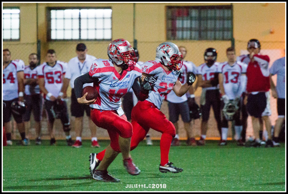 Gli Skorpions hanno dominato in lungo e in largo, beneficiando anche di regali mastodontici che hanno alleggerito il loro compito. Già all’intervallo si sono ritrovati ad amministrare un vantaggio di 21 punti. La loro pressione è stata regolare e penetrante. Come al momento di sbloccare il risultato quando si sono serviti del trucco ad effetto per smarcare Granelli e imbeccarlo solitario al momento giusto. L’autostima rosso argentea viene soffocata definitivamente complice un fumble evitabilissimo che il lesto Tettamanti ricopre e capitalizza con una corsa di circa cinquanta iarde. Forse pesano le assenze di Andrea Lianas, Davide Cappai, Max Mandas, Edoardo Porcu e Luca Puddu.