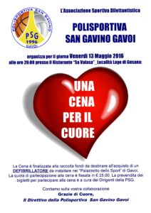 Sulla base di quanto dettato dalla normativa, ma anche dalla propria sensibilità sul tema, la nostra Polisportiva ha pensato di organizzare una cena per affrontare la spesa organizzando una cena di beneficenza per acquistare un defibrillatore per il Palazzetto dello Sport di Gavoi. Un acquisto difficile, ma non impossibile, da sostenere per una realtà dilettantistica come la nostra.