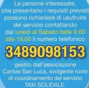 Il TAXI SOLIDALE è un servizio di trasporto pubblico collettivo, interamente gratuito, promosso dalla Caritas e finanziato dall’Amministrazione comunale, al fine di garantire alle persone disabili, anziane e a coloro che risultino svantaggiati, in maniera momentanea o permanente, in ragione di condizioni fisiche, psichiche, sociali o familiari, la possibilità di usufruire di un mezzo di trasporto, idoneo alle loro esigenze, che possa consentire di accedere agevolmente alla rete dei Servizi Sanitari Regionali e, in generale, ad altri servizi e luoghi di socializzazione. Il servizio viene effettuato nell’ambito del territorio comunale e dei Comuni limitrofi.