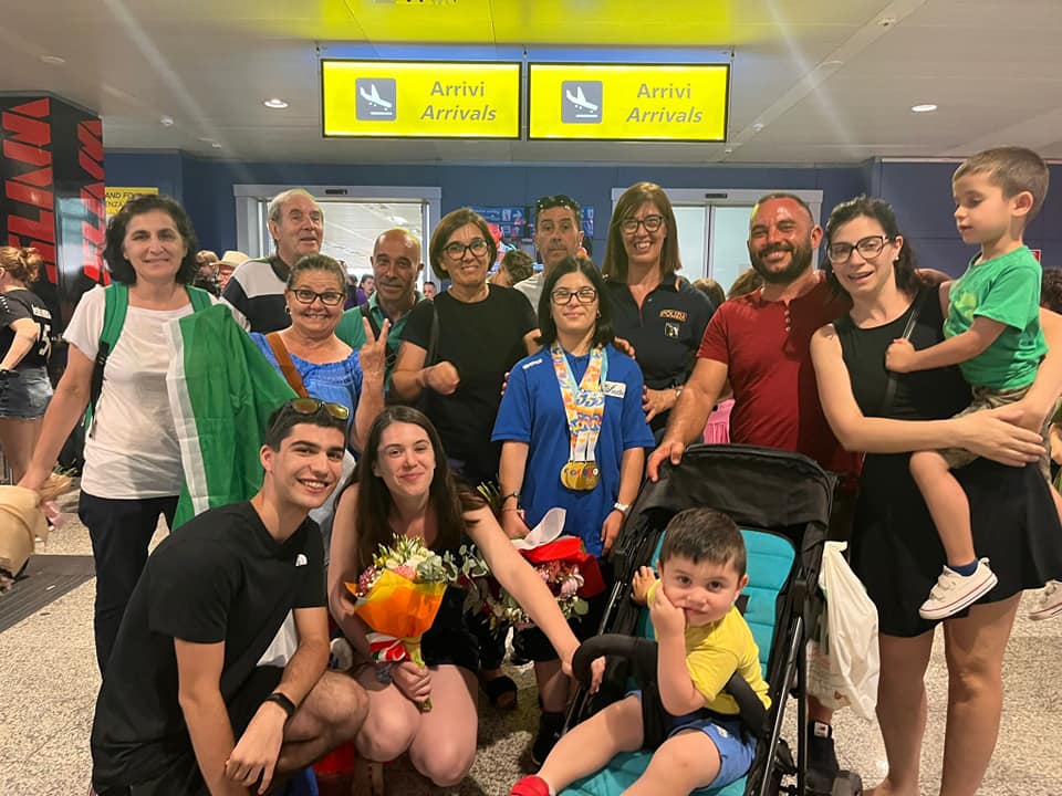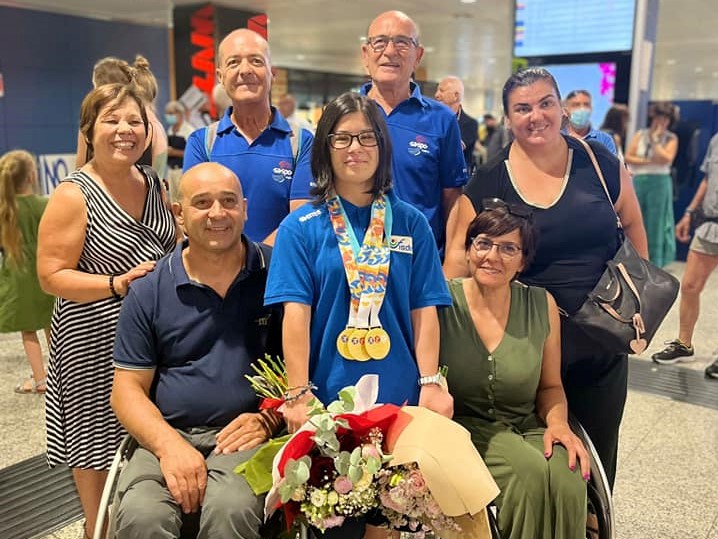 Tre ori mondiali, tanto affetto e immutata voglia di migliorarsi. Chiara Statzu da Marrubiu compie un’altra impresa ai DSWorld 2022, forse la più bella da quando è diventata un’atleta di punta della nazionale FISDIR di Atletica Leggera. La mezzofondista saspina assolve i suoi compiti su 800 e 400 metri piani realizzando anche il record nazionale in quest’ultima misura (1:32.58). E poi si scopre anche velocista di razza imprimendo il suo ritmo nei 200 metri. Un exploit di queste proporzioni merita le giuste attenzioni e quando Chiara è tornata dalla trasferta di Nymburk e Mladá Boleslav (Repubblica Ceca), all’aeroporto di Elmas, oltre ai familiari più stretti, non è mancato il sindaco di Marrubiu Luca Corrias e il presidente del suo club di appartenenza Luciano Lisci, affiancato da una nutrita rappresentanza.