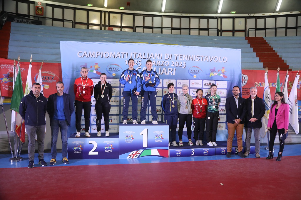 I tre podi dei doppi assoluti sono stati premiati da Renato Di Napoli, presidente FITeT, Bruno Perra, presidente del CONI Sardegna, l’Onorevole Alessandro Solinas, Consiglio Regionale Sardo, il Tenente Colonnello Marco Carfì, Capo Prima Sezione Agonistica Gruppo Sportivo Esercito Italiano, Gennaro Coppola, Primo Luogotenente e Capo Seconda Sezione Centro Sportivo Aeronautica Militare, Simone Carrucciu, presidente del Comitato Regionale FITeT Sardegna e commissario regionale CIP, Giuseppe Marino, segretario generale della FITeT, Daniele Pittau, presidente regionale Federazione Danza Sportiva e membro Giunta CONI Sardegna, e Gianluca Lilliu, presidente regionale Federazione Bocce e membro Giunta CONI Sardegna.