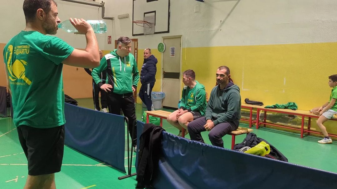La Muraverese, a sua volta, solidarizza con la n. 1 del campionato e spartisce la posta con un’altra squadra in ascesa, il Tennistavolo Quartu, lasciando immutati i tre punti di distacco dal team decimese. Un primo colpo di scena avviene nell’incontro di apertura con Marco Isola che non gestisce al meglio due set di vantaggio e perde nei confronti di Luca Paganelli. Il club sarrabese allunga: Roberto Chessa non teme Vincenzo Meloni. Ma è nell’aria il contro break quartese a suon di 3-0: Nicola Orani capitalizza prima con Pierluigi Montalbano e poi con Paganelli. In mezzo c’è il riscatto di Isola su Chessa. Il pari definitivo lo firma Montalbano su Gianfranco Ibba.