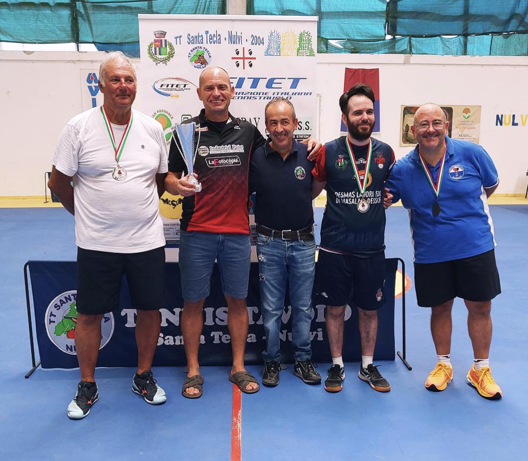 Nelle vicende agonistiche di sabato lo scettro era stato impugnato saldamente dal turritano Pierpaolo Mura che partiva con i favori del pronostico. È lui stesso a raccontare le vicende che lo hanno portato in cima al podio: “Quando si riprende la stagione agonistica, l’inizio è sempre un rebus. Quando con mia figlia Marialaura sappiamo del torneo, decidiamo di iscriverci, più per lei visto che era due mesi ferma senza toccare racchetta. Altrettanto io. Con la scusa di accompagnarla mi sono buttato nella mischia come spesso succede da quando gioca. Fisicamente sto molto bene, in questi mesi estivi mi sono ritagliato del tempo per rimettermi in forma tra nuoto, bicicletta, corsa. Arrivati al Palazzetto nulvese, durante la fase di riscaldamento diamo una sbirciatina ai tabelloni. Nel mio girone, da tre, competo con Claudio Ruggiu (Il Cancello Alghero) e vinco 3-0. Poi incontro Massimo Posadinu (Santa Tecla) che conosco da un sacco di tempo: ne esce un altro 3-0 dove recupero il secondo parziale (9-5 per lui, ma chiudo 11-9). Finita la fase gironi trovo una vecchia conoscenza del pongismo isolano, Mauro Usai (Enrico Fermi Iglesias): lo ricordo già da quando stavo iniziando a giocare a tennis tavolo (11/12 anni), mentre lui era già un assiduo frequentatore dei tavoli assieme con Marcello Porcu, Sandro Poma etc etc. Giocatore ibrido, difensore, attaccante, gran mano sensibile con schiacciate improvvise, ma vinco 3-1. In semifinale incontro Mark Anderson, altro giocatore del TT Nulvi che nel turno precedente ha eliminato mia figlia. Vinco 3-1: il primo lo vince lui 11-7 gli altri tre gli chiudo 11-5, 11-8, 12-10. Quest’ultimo matura dopo continui batti e ribatti. In finale trovo Raffaele Bernardini, giocatore con puntinata sul rovescio, liscia sul dritto, che milita nella rosa del TT Rimini, in vacanza da queste parti con la moglie, anche lei giocatrice. Grande schiacciatore, prepara il dritto con la puntinata per poi chiudere. Capisco il meccanismo di gioco, chiudo 3-1 con parziali 12-10, 11-8, 5-11, 12-10. Complimenti al TT Nulvi per la manifestazione che meritava un numero maggiore di iscritti”.