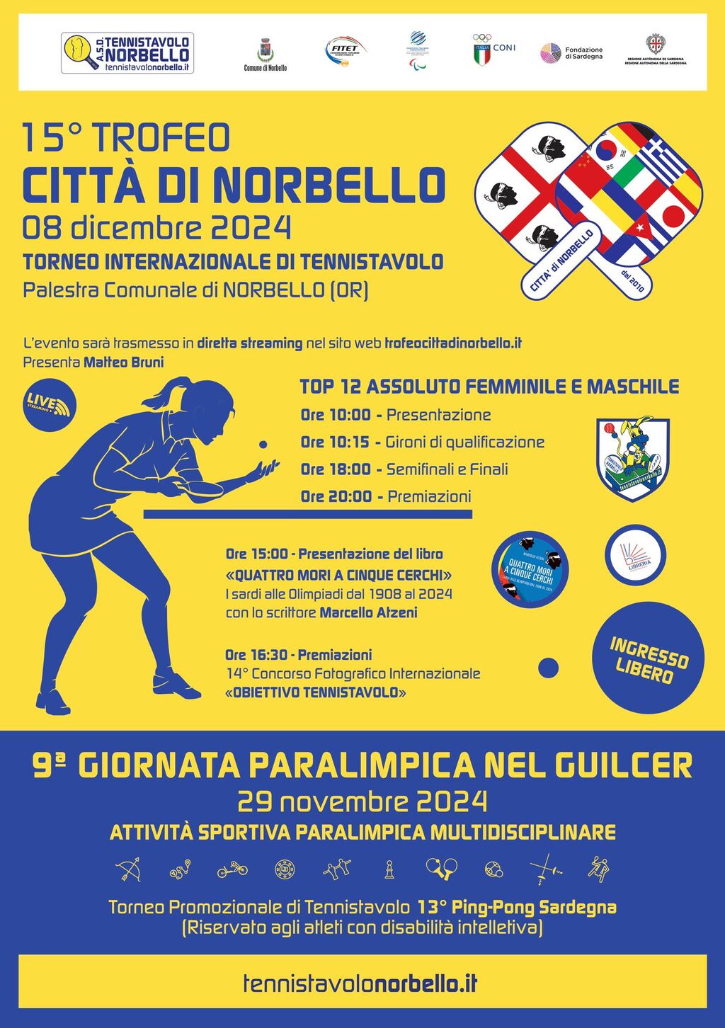 Il Trofeo Internazionale Città di Norbello giunge alla sua quindicesima edizione. Coincidente con la festa dell’Immacolata (domenica 8 dicembre) si caratterizza per l’alto spessore pongistico con due Top 12 assoluti femminili e maschili. Per tutta la giornata si alterneranno momenti agonistici a parentesi extra sportive come la presentazione del libro di Marcello Atzeni “Quattro Mori a cinque cerchi I Sardi alle Olimpiadi dal 1908 al 2024” (Sandhi Edizioni) con inizio alle 15:00, o come la premiazione del concorso fotografico internazionale Obiettivo Tennistavolo, esistente da ben 14 edizioni (ore 16:30).
