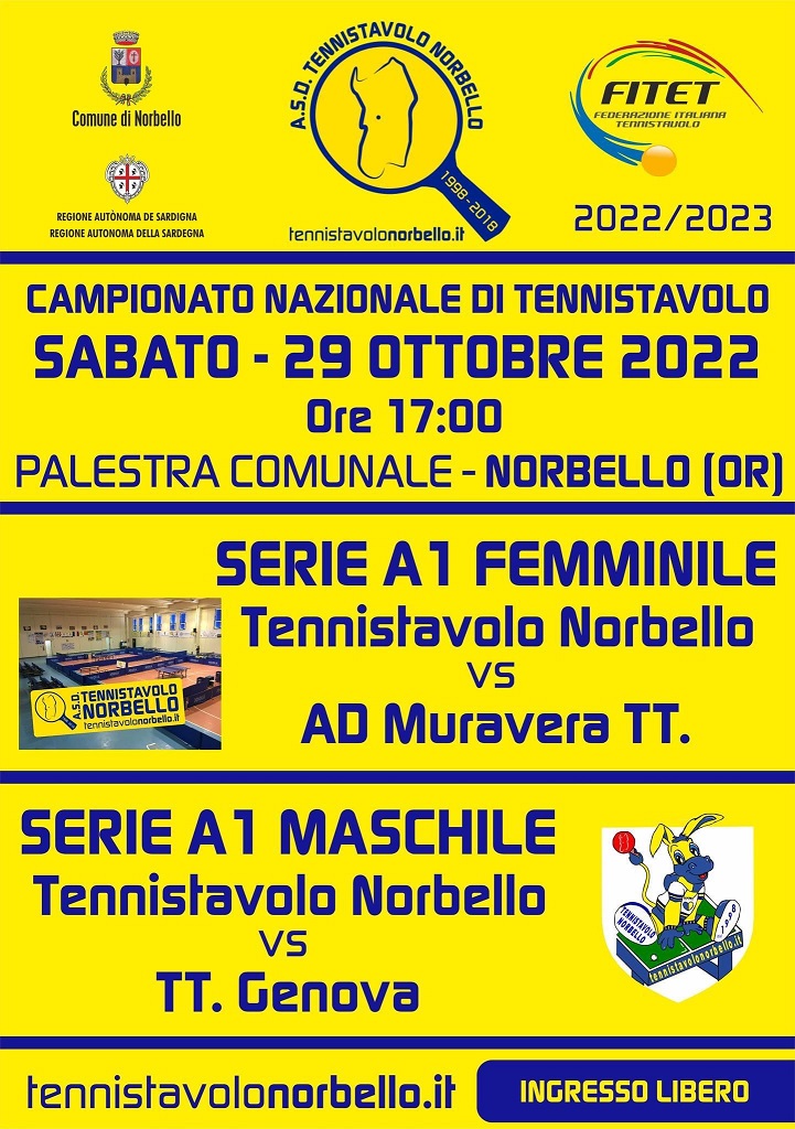 abitudini e gli amici sportivi vengano numerosi a vedere uno spettacolo di alto livello che pongisti provenienti da tutto il mondo ci concedono sui nostri tavoli. Soprattutto per acclamare femmine e maschi che indossando la maglia giallo blu portano in giro per il mondo il nome di Norbello. Mi auguro che sia un ponte festivo, ricco di spunti ma soprattutto di gioie. Forzaaaaa”.